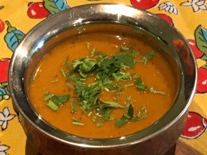 Add the lime rind and paprika. Purée the soup, I use an immersion blender. Add salt. Just before serving, add the coconut milk., on a low flame. Simmer and serve, with a garnish of fresh coriander and a squeeze of lime juice.