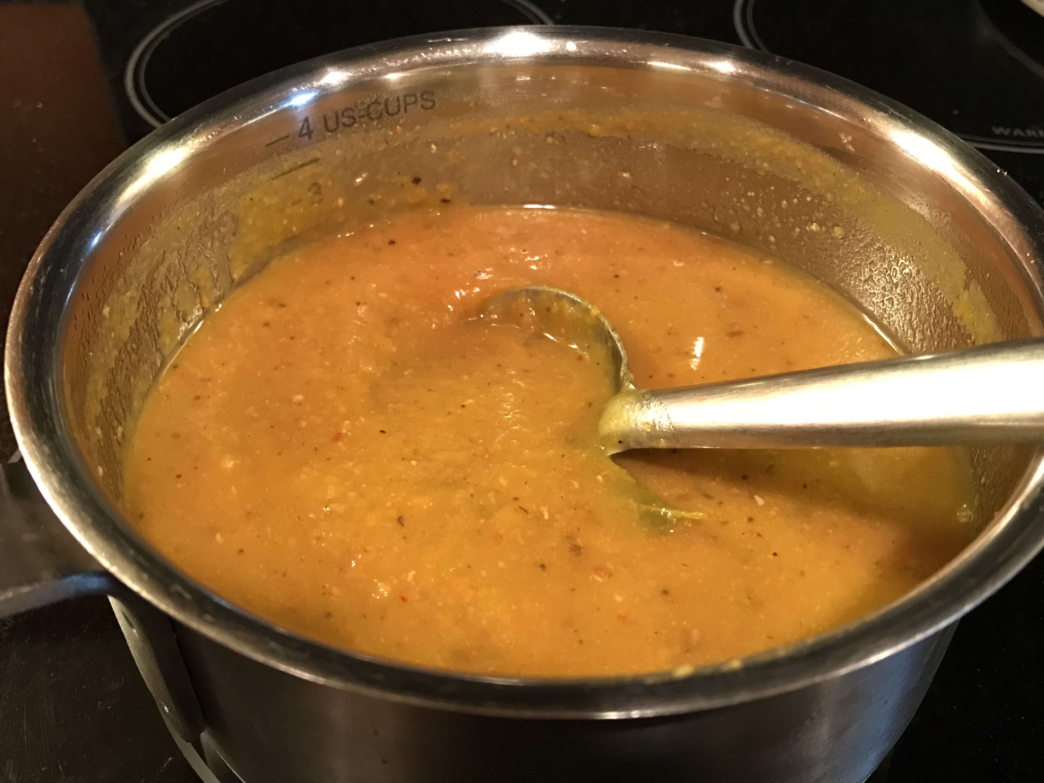 Add the lime rind and paprika. Purée the soup, I use an immersion blender. Add salt. Just before serving, add the coconut milk., on a low flame. Simmer and serve, with a garnish of fresh coriander and a squeeze of lime juice.