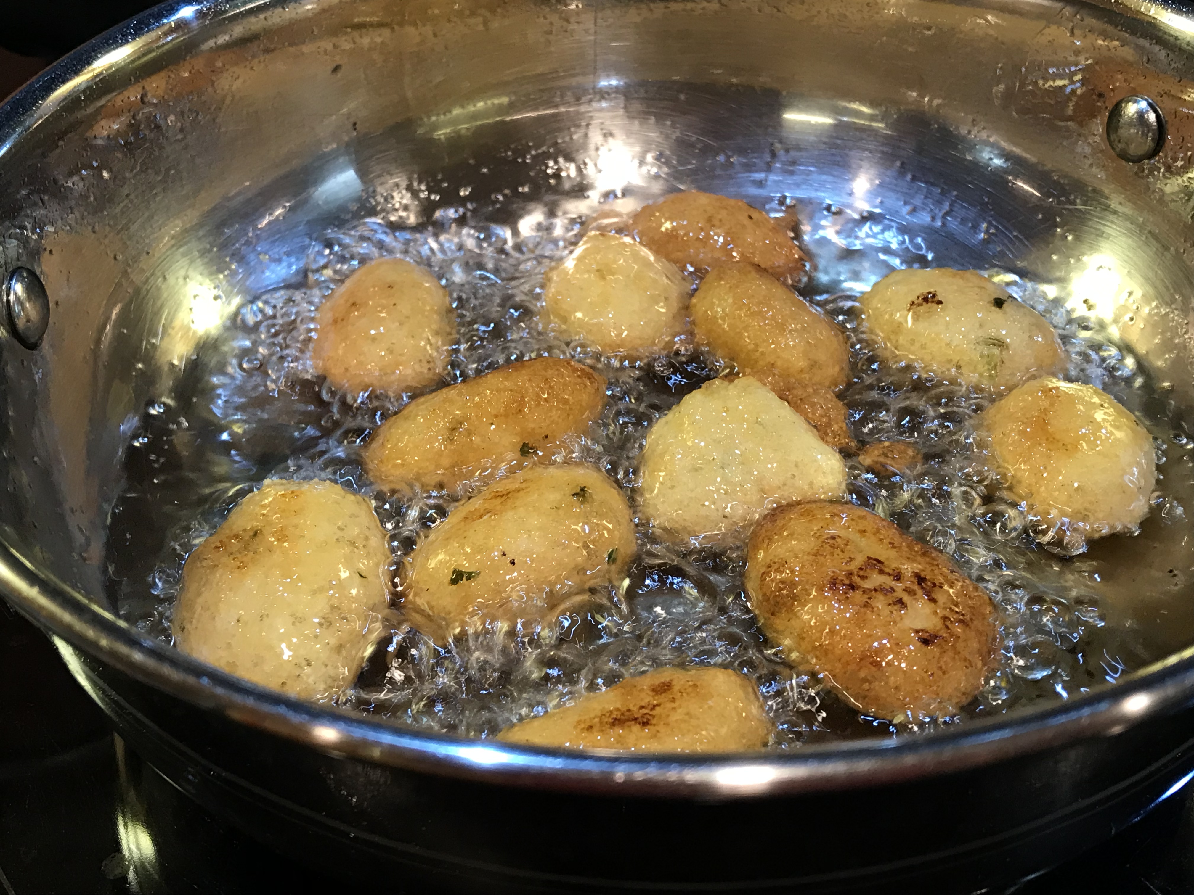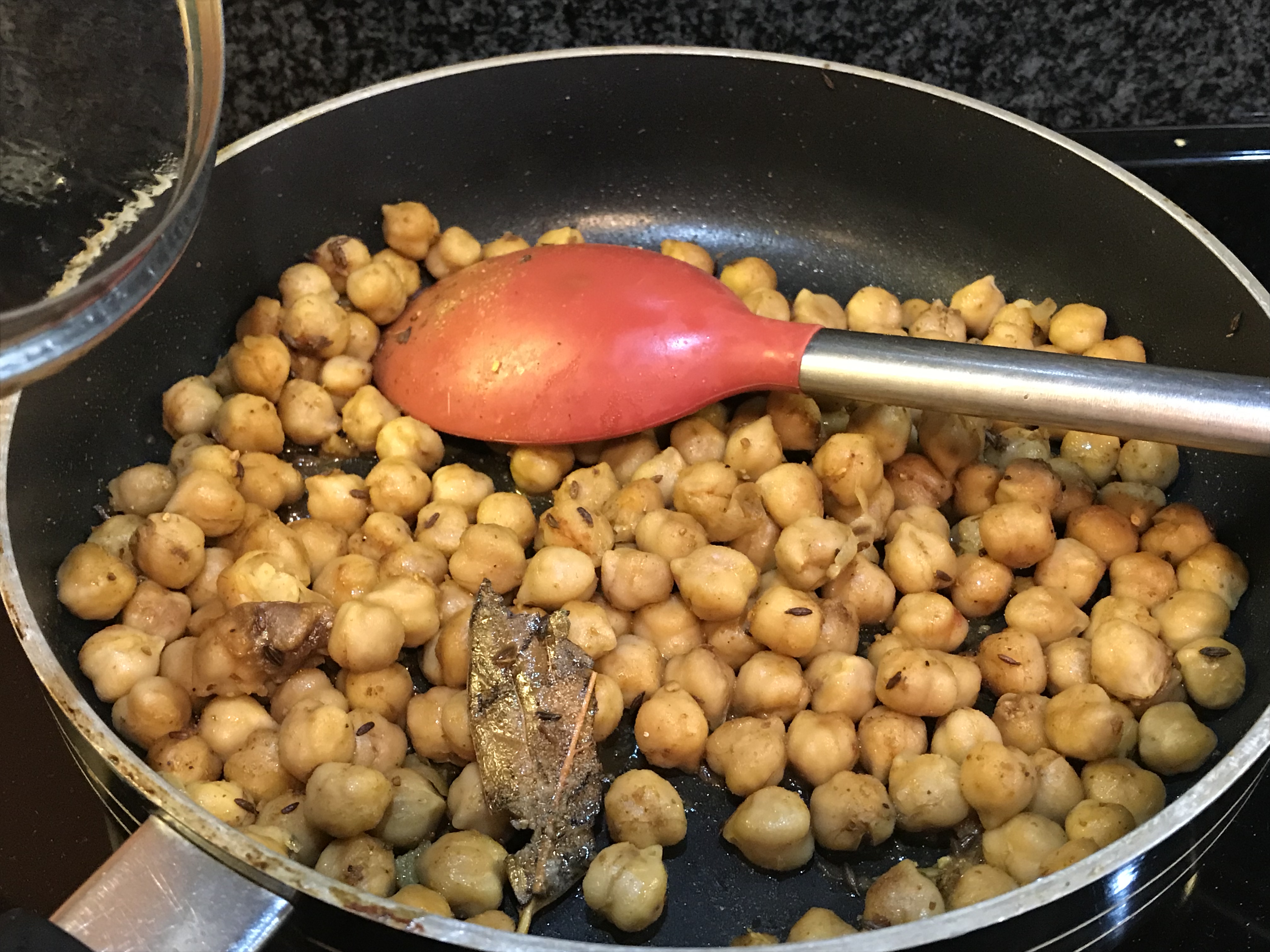 Heat a teaspoon of ghee, yes, only ghee, in a pan. Add a teaspoon of cumin seeds, a pinch asafoetida or hing, a small cinnamon stick, a bay leaf. Toss in the canned garbanzo beans and stir. To spice it up, add a dash of roasted cumin powder, turmeric, red chilly powder, garam masala powder. To enhance the flavor, I added store-bought chana masala powder. Add salt to taste. Add the boiled potatoes and stir well. Set aside.