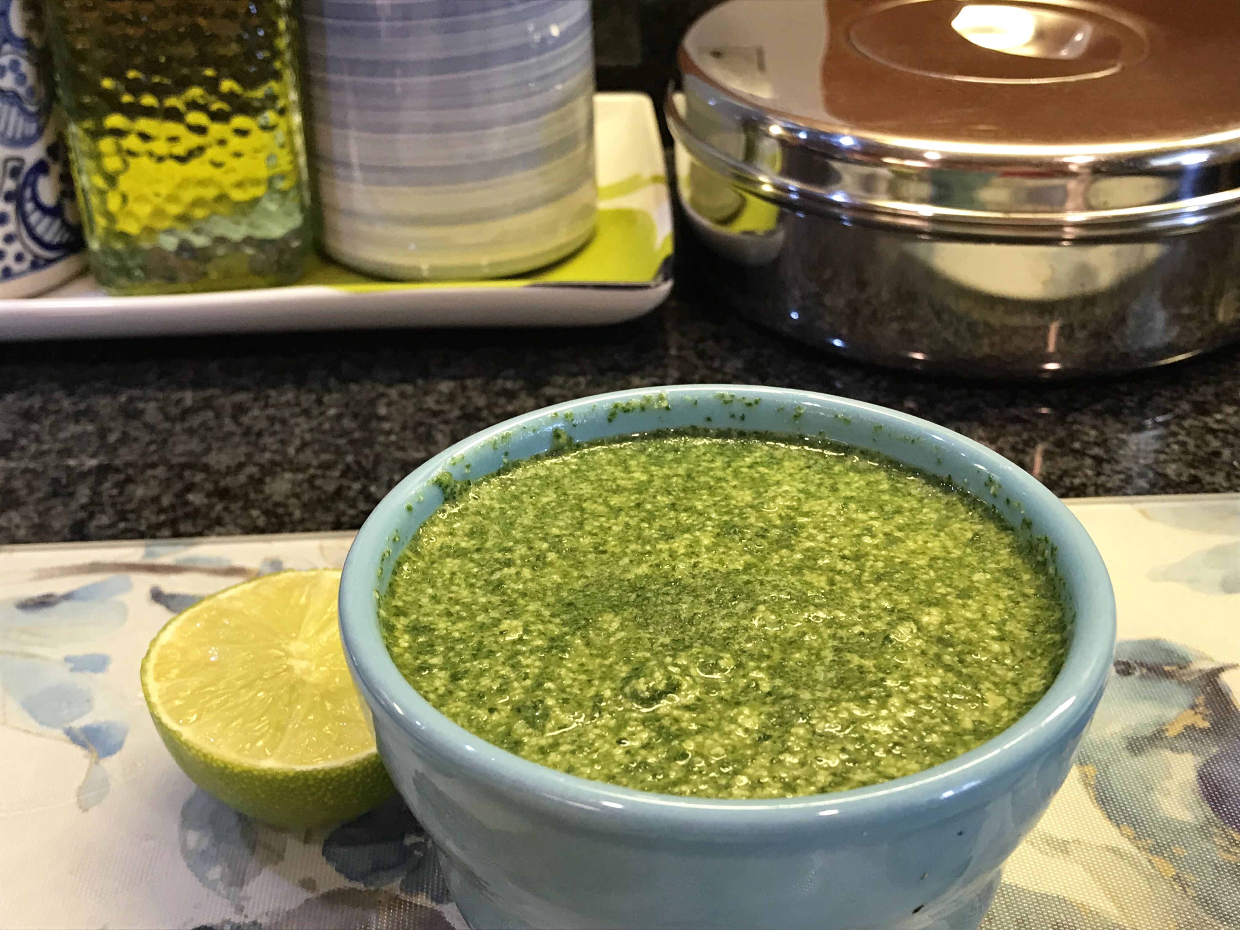 In a food processor, toss in a big handful of fresh coriander, a few fresh mint leaves, green chilly(as per taste), and a teaspoon of roasted dalia (roasted split chickpeas). One can substitute with a few peanuts too. Lots of freshly squeezed lime juice, a pinch of salt, and grind it all together to make a fresh green chutney.