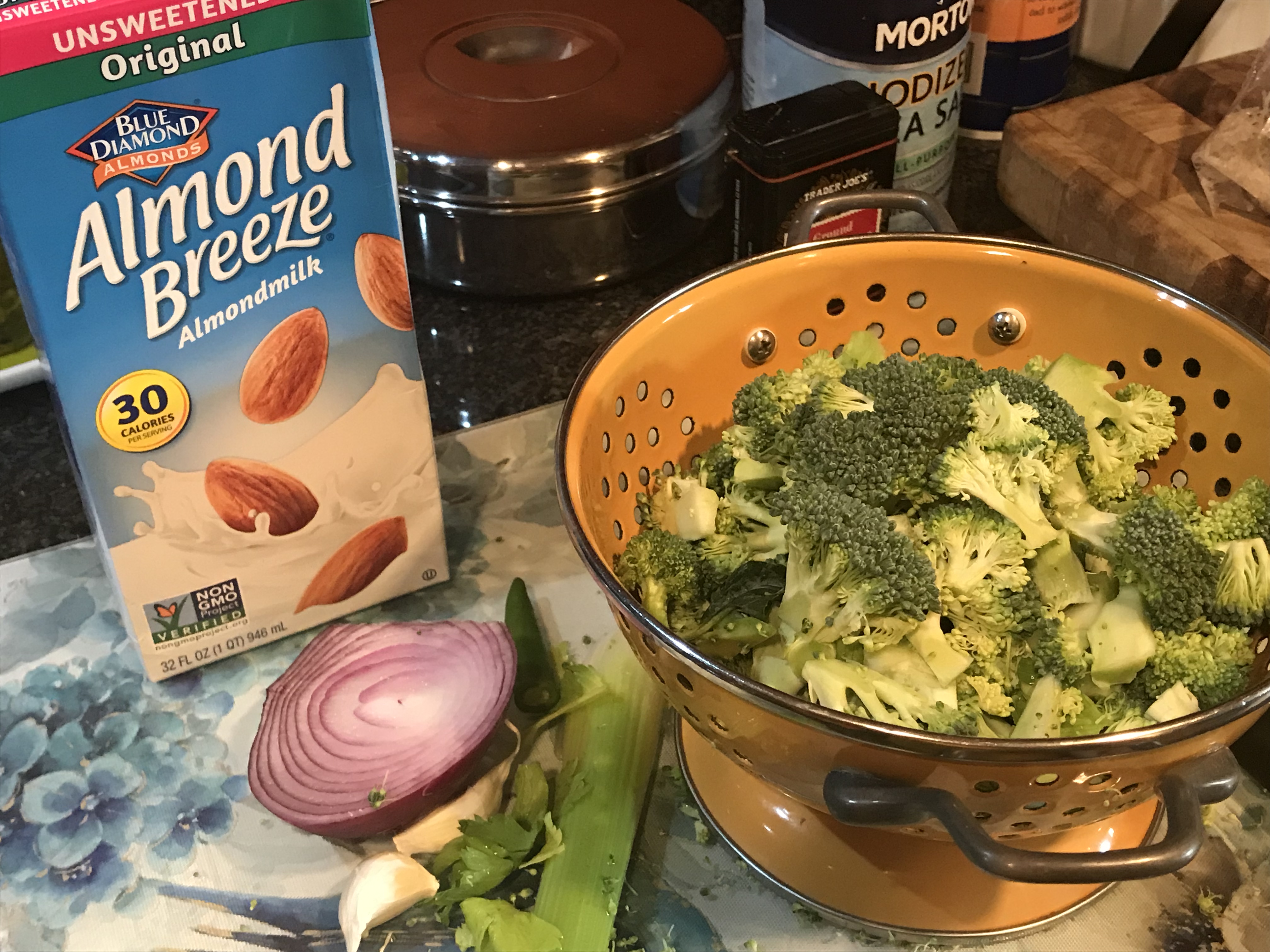 Fresh broccoli, simmered with onions, celery, garlic and green chill, and store-bought unsweetened almond milk. Tempered with cumin seeds and paprika, and served with a garnish of fried rice vermicelli and avocado-salsa relish (optional). It’s vegetarian and gluten-free.