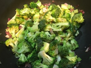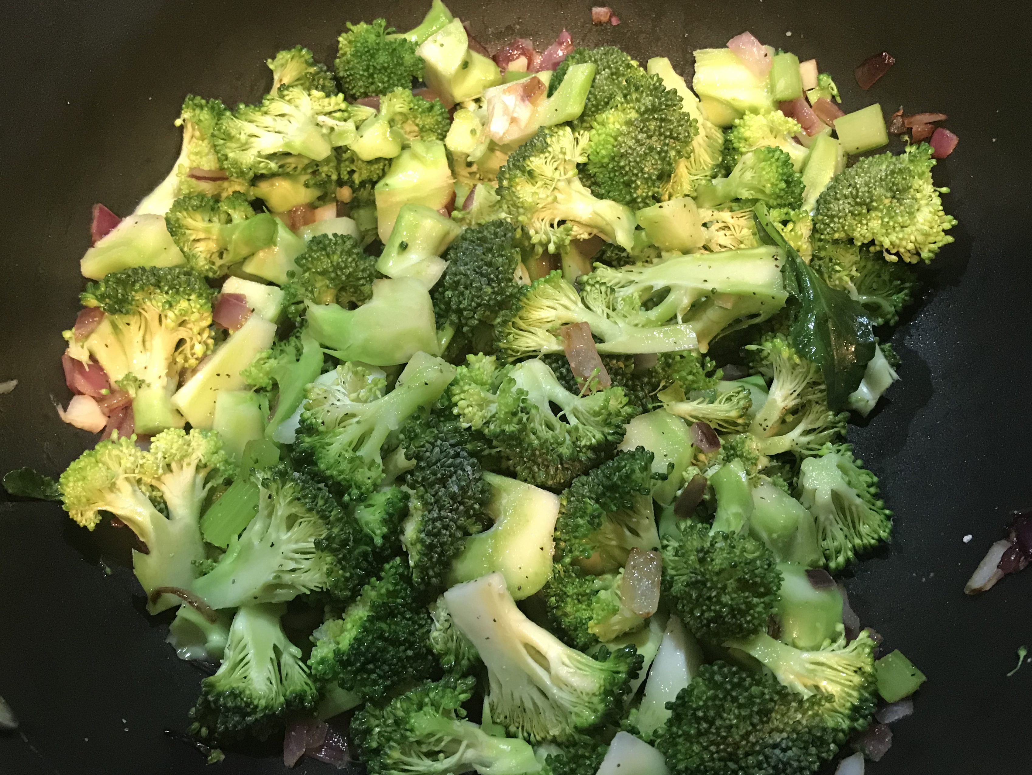 In a deep bottomed pan or Dutch oven, heat a tablespoon of olive oil. Add the onions and celery and sauté till the onions start turning translucent and light pink. Add the garlic and green chilies and sauté for a minute. Add the broccoli florets and stir well. Add salt and pepper and 1 cup of water. Cover with lid and steam for a couple of minutes on low flame.