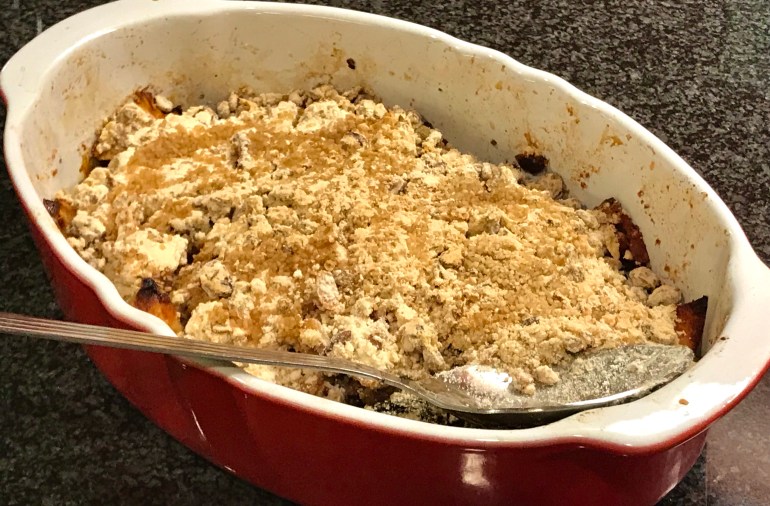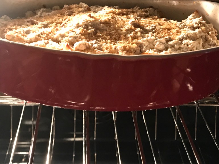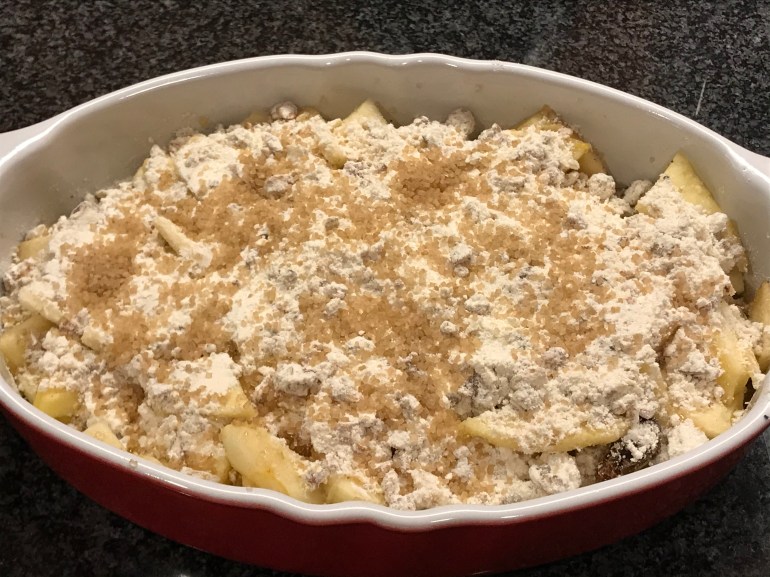 Layer the topping on the apple mixture and press lightly. Sprinkle a little sugar. Bake in a pre-heated oven at 375 F for 45 minutes to an hour, or till the crumble is golden and crisp.