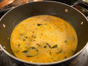 Add kaffir lime leaves. Bring to a boil, simmer and cover and cook till potatoes are nearly done. Add the salmon chunks. Add coconut milk. Season with salt and pepper.