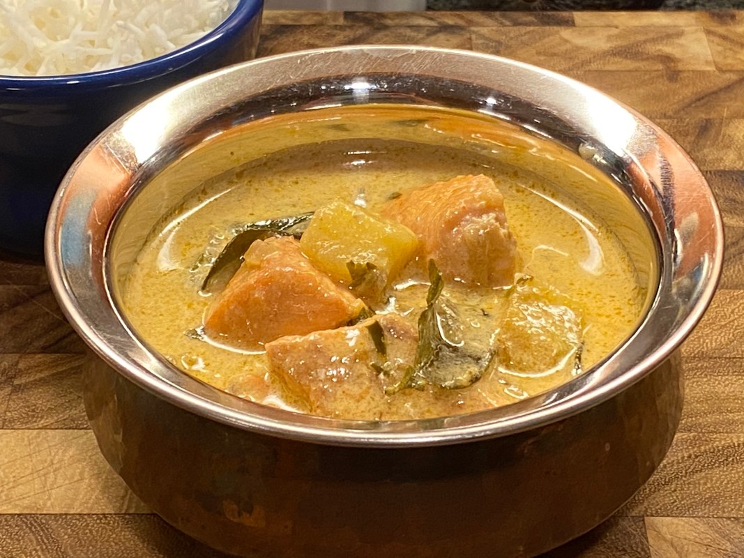 Cover and simmer for 10 minutes, or till salmon is cooked. Add fresh cilantro and a squeeze of fresh lime juice. Serve with jasmine rice or flaky Malabar parathas.