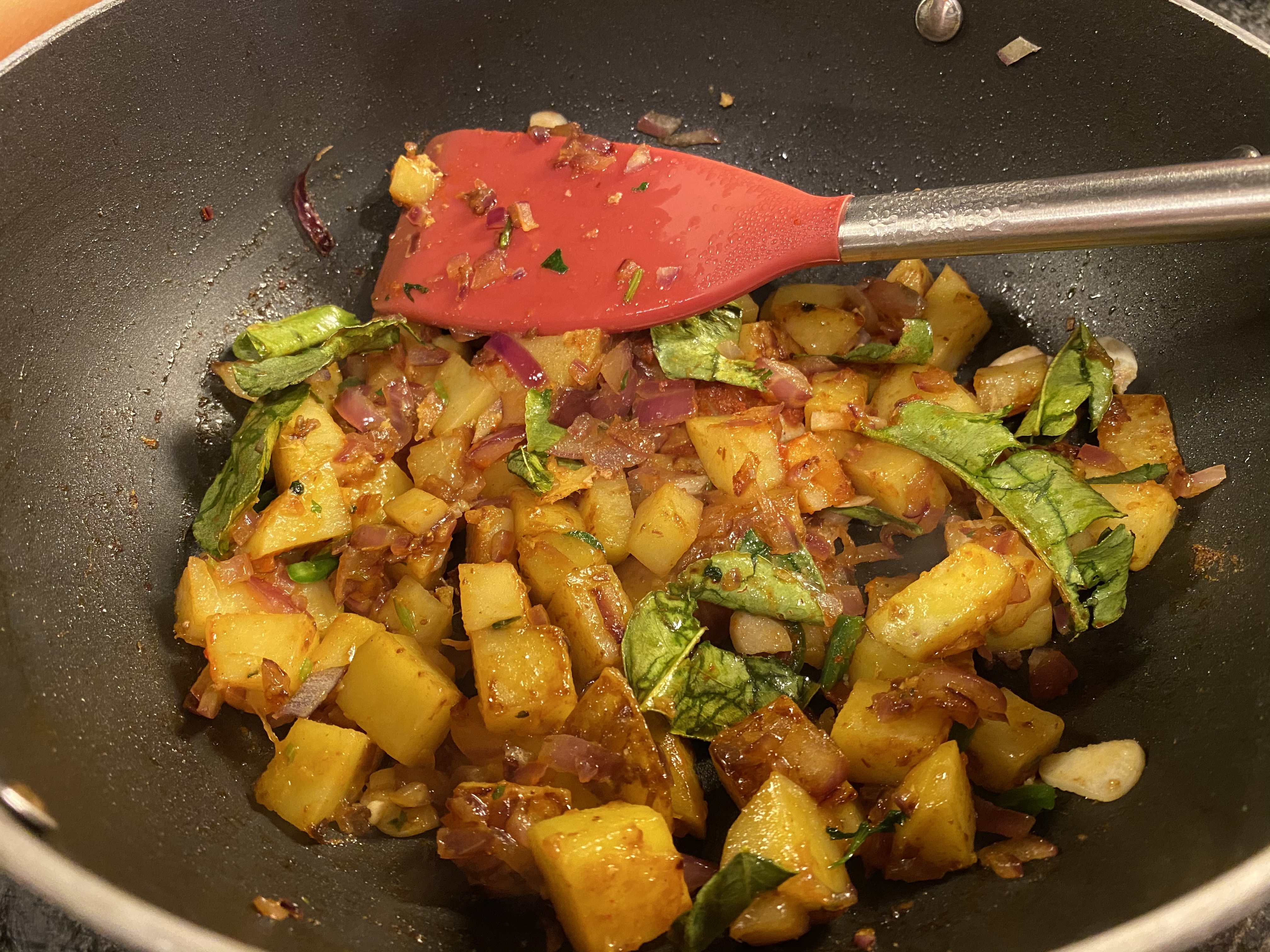 In the same pan, add the potatoes. Stir-fry for a few minutes, till they start turning light golden. Add the onions, and saute till the onions turn light pink. Add the thyme sprigs, ginger and garlic and stir well. Add the red curry paste and stir fry for a couple of minutes. Add the water.
