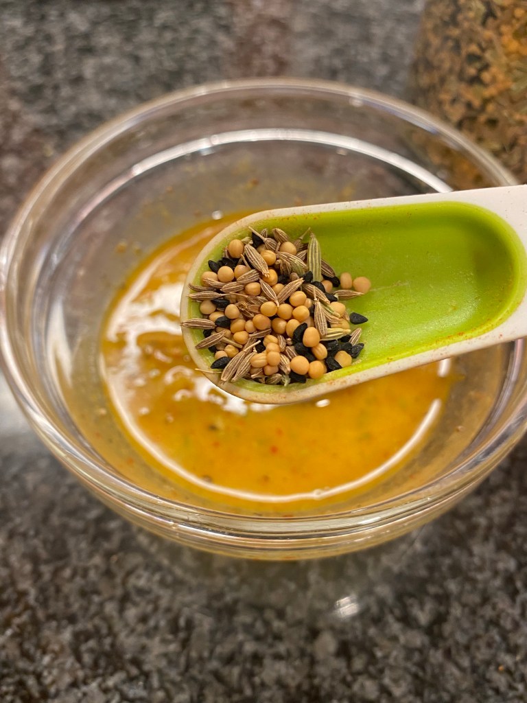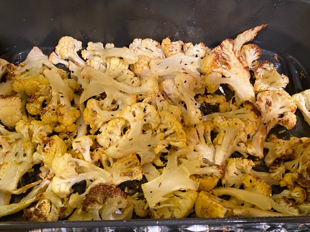 Fresh cauliflower florets, mixed together with tahini, paanch-phoron spices(a Bengali/ Eastern Indian spice blend), rice flour and ground spices, and roasted in an air crisper oven. Paanch-phoron is a 5 spice blend of seeds, namely: nigella, cumin, fennel, fenugreek and mustard seeds. Tahini, or sesame seeds paste compliments the flavors very well in this recipe. Since I have used the air crisper cooking option in my oven, which I believe is quite similar to air frying, I’ve coated the florets with rice flour, for a crispy texture. Of coarse, with an air crisper or fryer, amount of oil or fat is considerably low or non-existent.
